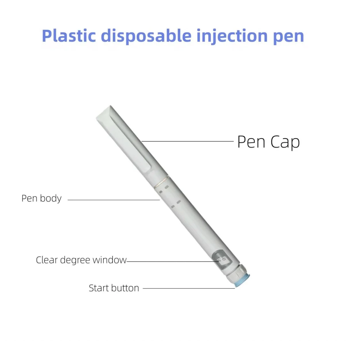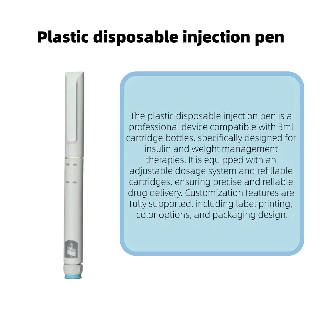The plastic disposable injection pen is a professional device compatible with 3ml cartridge bottles, specifically designed for insulin and weight management therapies.
